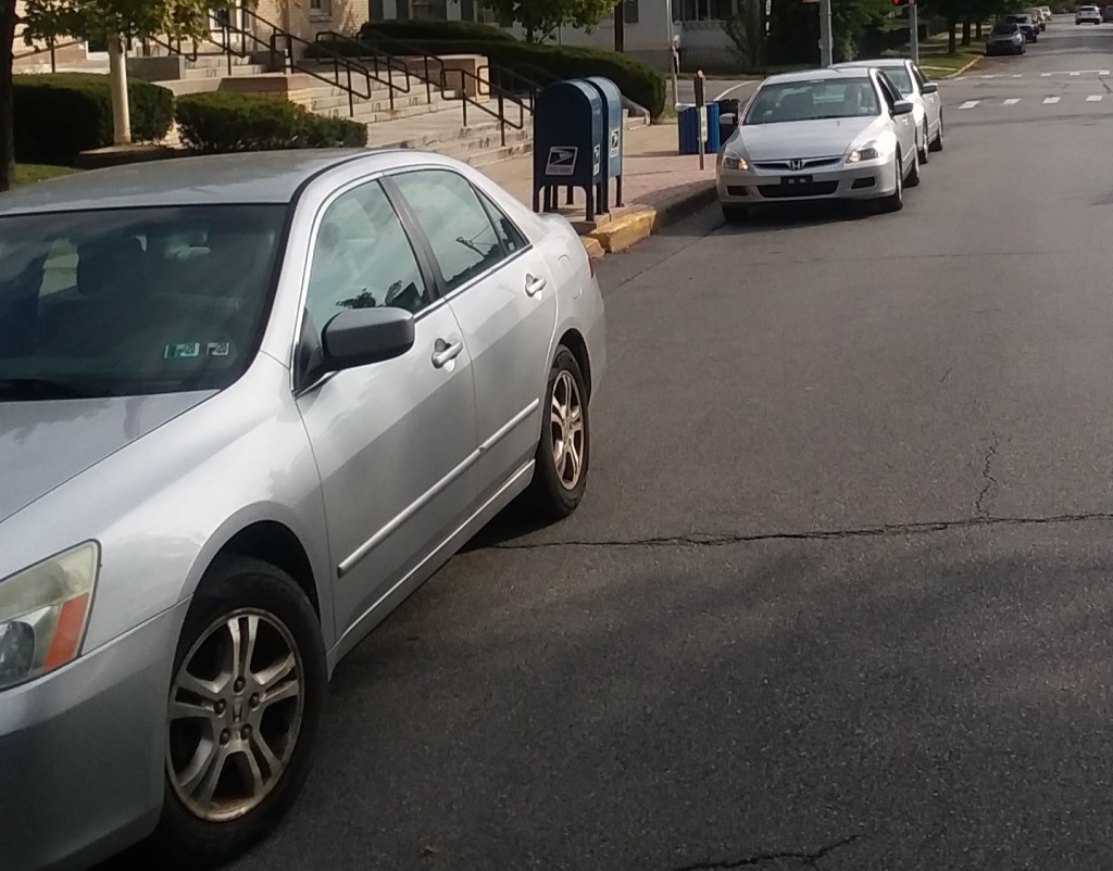 I couldn’t believe the odds, probability, or chances. I had to tell him that MY similar Honda was parked across the street in the lot. He was talking to a guy with a third silver Honda – same body style, probably same year.