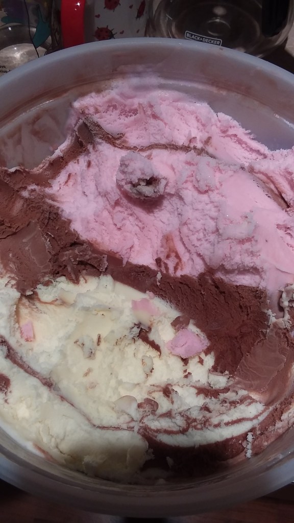 I didn’t buy this tub. The man that did always buys too much. He means well. He really, really does. I think he either expects everyone to eat a bigger portion of ice cream than they ever did at any point in their life, or, he wasn’t good at math in school. Whatever the case, the intent is sincere – and my ever increasing waist line thanks him, sarcastically, for it…