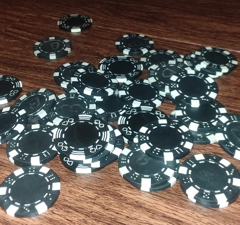 Strewn about in the picture are “big boy” chips. The (ahem) friendly game we play progresses to the point where these are the only ones in play. One must be 1.) diligent and somewhat skillful to be at the table this late in the game, and 2.) have a decent number of chips to remain competitive. I don’t always qualify on both counts … that is, even if I make it that far. I really do play to have fun. Really.