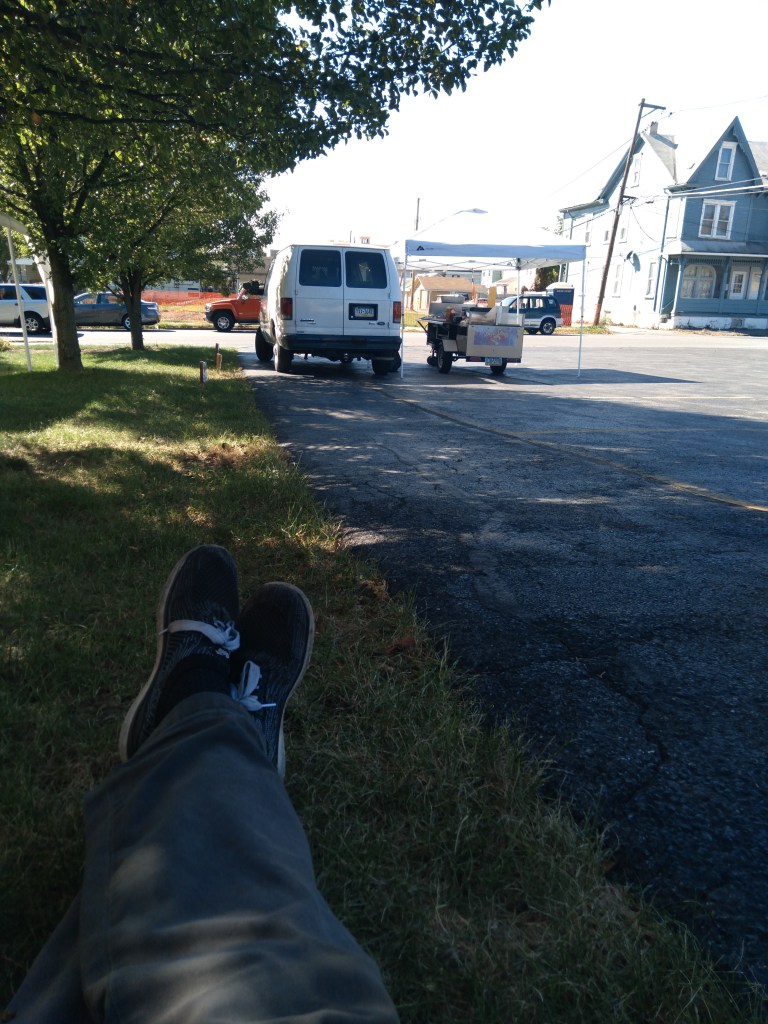 All is not lost on me, however. I have a very solid brick wall steadying my sore back at this moment. The shade of a friendly tree is keeping me company as, on other days, customers would. We’re at a comfortable 70-degrees with a very slight breeze lifting my spirits over the steady flow of hurried traffic buzzing by on 6th avenue to my left. It would be my wish to have one, possibly two, of those destinal auto occupants stop for a munchie, but alas this is not to be today. S’ok. One hour left to serve … maybe, just maybe.