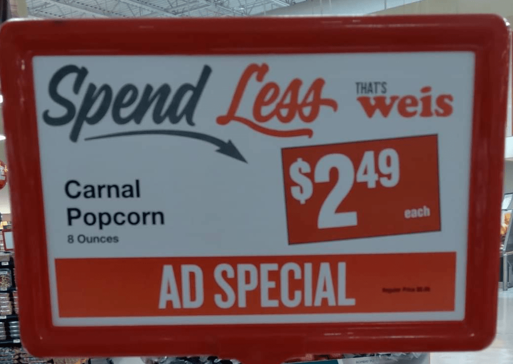 You can’t be serious all the time. Even a local grocery store, in their attempt to sell popcorn to the masses, finds a comedy error in a sign of the times: