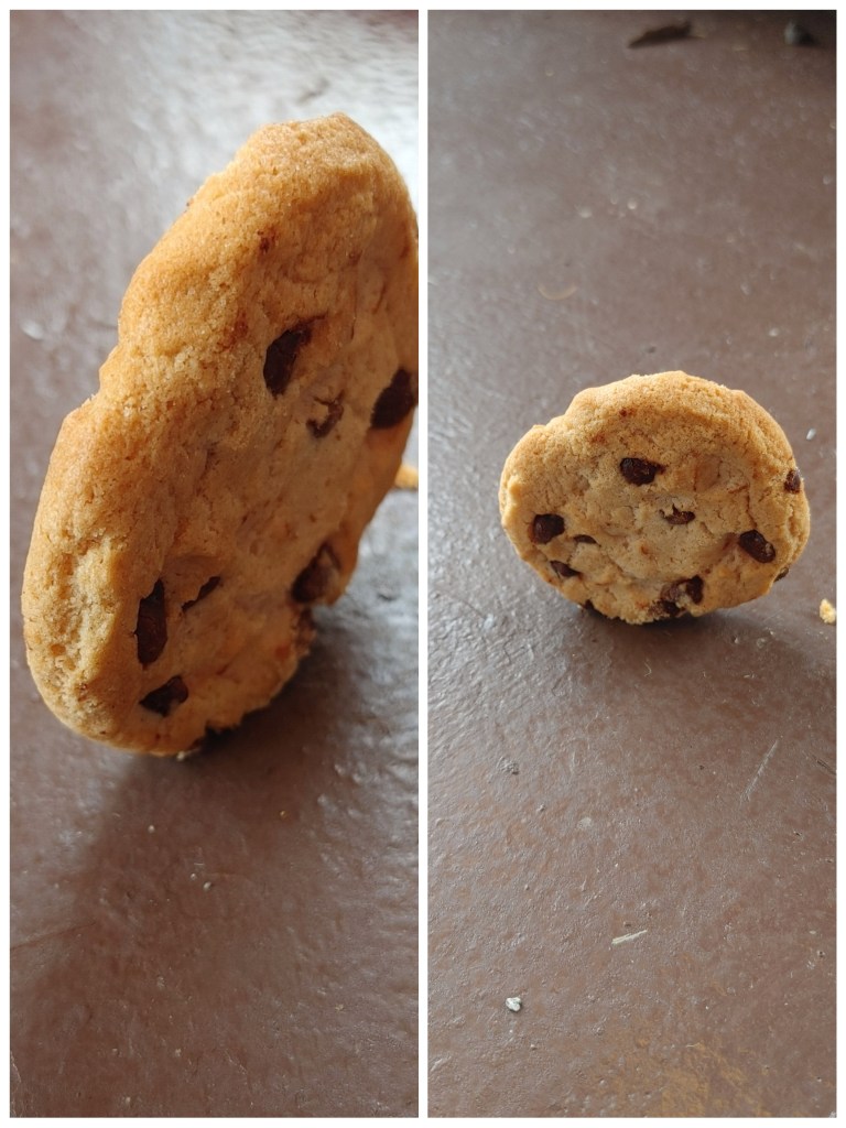… And landed on its side. Straight up, perpendicular to the the floor, six inches from my sandaled feet. I looked down in amazement. One cookie. One mistake in over five decades of chocolate yumminess and I’m rewarded with a miracle. Yes, a mystery that can’t be explained by a previously waiting-for-a-cookie crack in the concrete, or softness of said cookie that’s advertised as crunchy.