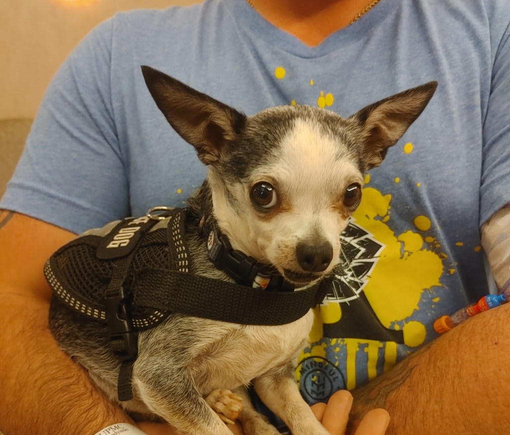 As time was clicking forward, I did need to get a move on toward the parking garage. Picture in tow – as it were – and the empty wheelchair safely back ready for a quick cleaning spritz and reuse, I said a quick, gracious thanks and headed down a long hallway. I was not so quick to forget about Creature cradled in nurturing arms, but anxious to send Greta a picture. She needed a loving doggie. If not in person during a quick exit out, at least over a FB message as a reminder that she wasn’t alone during a long ride home.