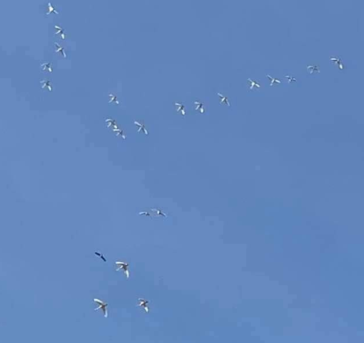 Wanting to belong, to be accepted. Attaching this very basic human need to the personality of a yet-to-be-identified bird. He didn’t know for sure, yet there his wings were – drafted into the same pattern set ahead by welcoming, perhaps even unsuspecting, friends ahead. Still pictures don’t give us the same perspective my friend had as these twenty-something (plus one) in numbers danced their way into her camera lens. She had a first-view account as she immediately accepted them as her friends … an acceptance of them into a world of photographic pleasure she enjoys as one belonging to nature itself.